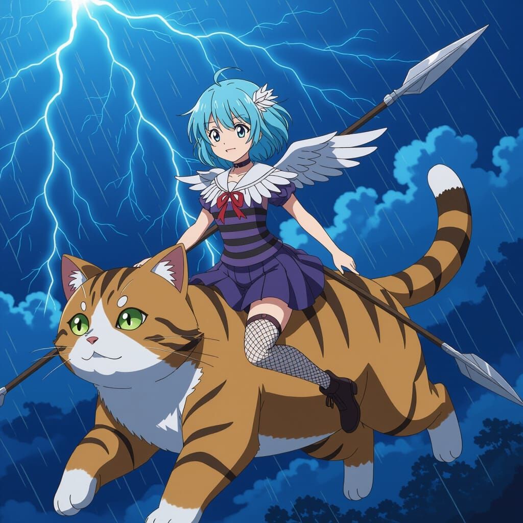 This image shows a young anime-style woman with short hair and winged decorations, flying on a giant cat through a stormy night sky. She is holding a spear in a vibrant anime style.