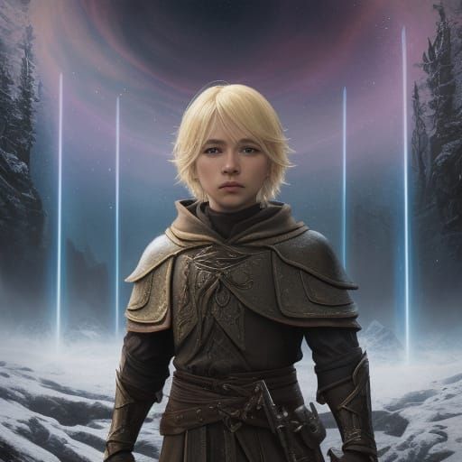 A radiant image of a young, blonde-haired boy dressed as a mage. He wears red wizard robes with cosmic sunfire garb, illuminated by iridescent light and god rays.