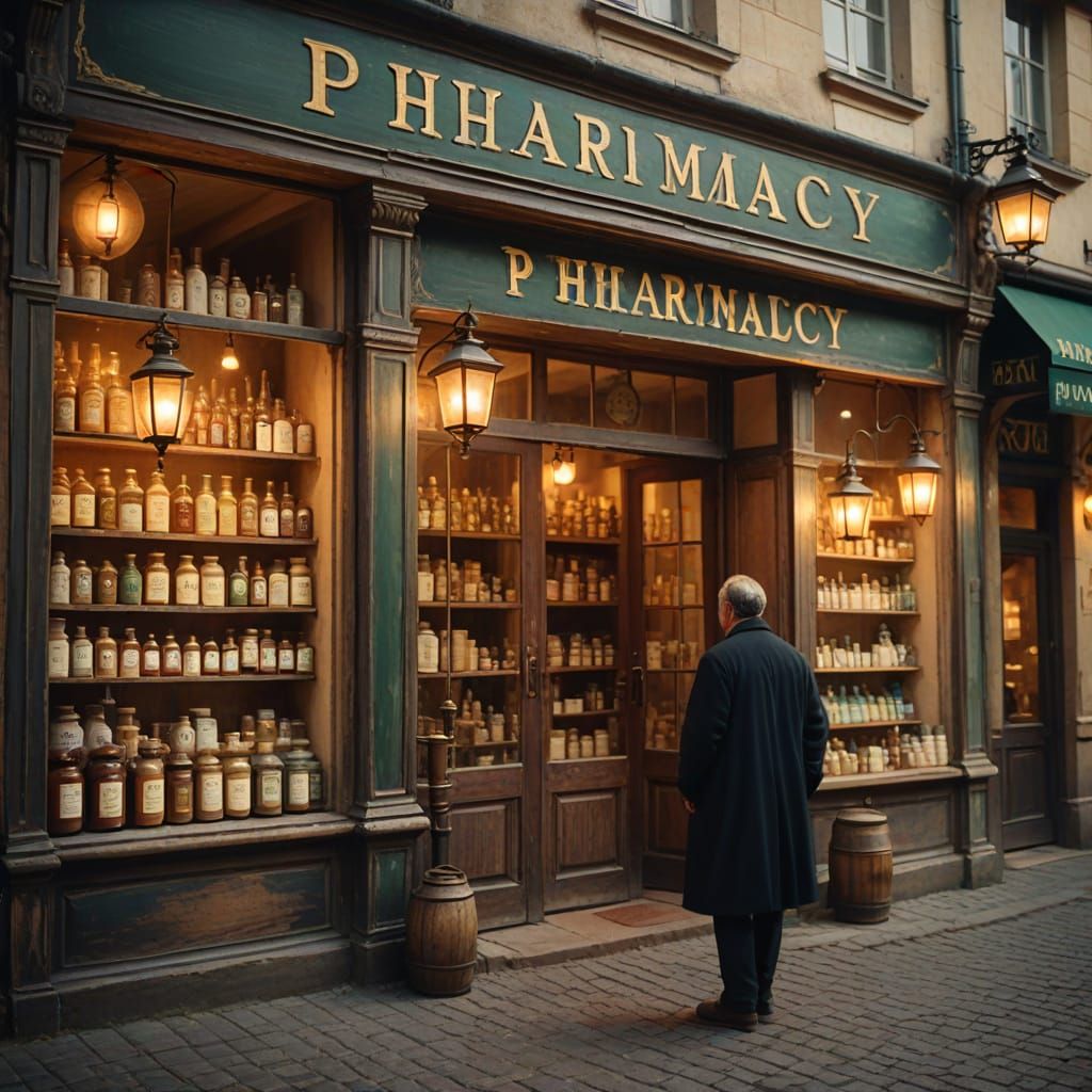 This image shows a French pharmacist outside a vintage pharmacy. The scene, reminiscent of an oil painting, features wooden signs, lanterns, and apothecary jars under warm lighting. The image evokes a nostalgic, old-world atmosphere.