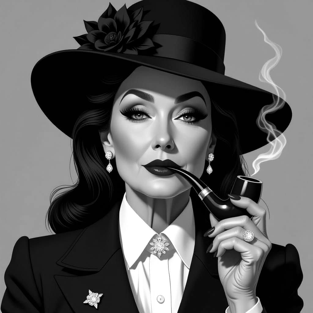 The image depicts an elderly, arrogant woman wearing a white shirt underneath a dark blue jacket, with long eyelashes, a pipe between dark red lips, a diamond earring, and a very expensive diamond fixed on a tie. Her black hair is tucked slightly under an expensive black hat with a black flower on one ...