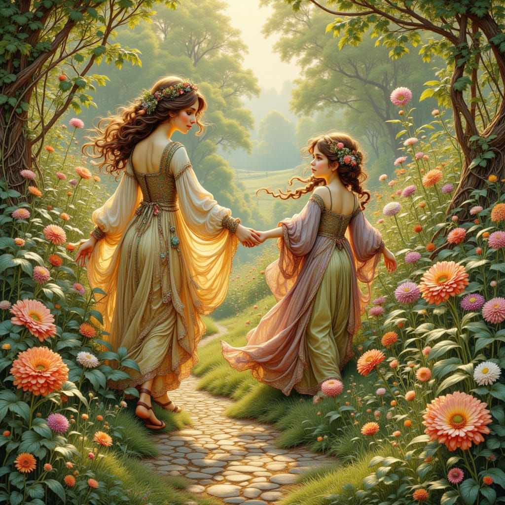 This image depicts a mother and daughter elegantly dressed, strolling through a vibrant fantasy garden on a sunny day, in a distinctive Art Nouveau style.