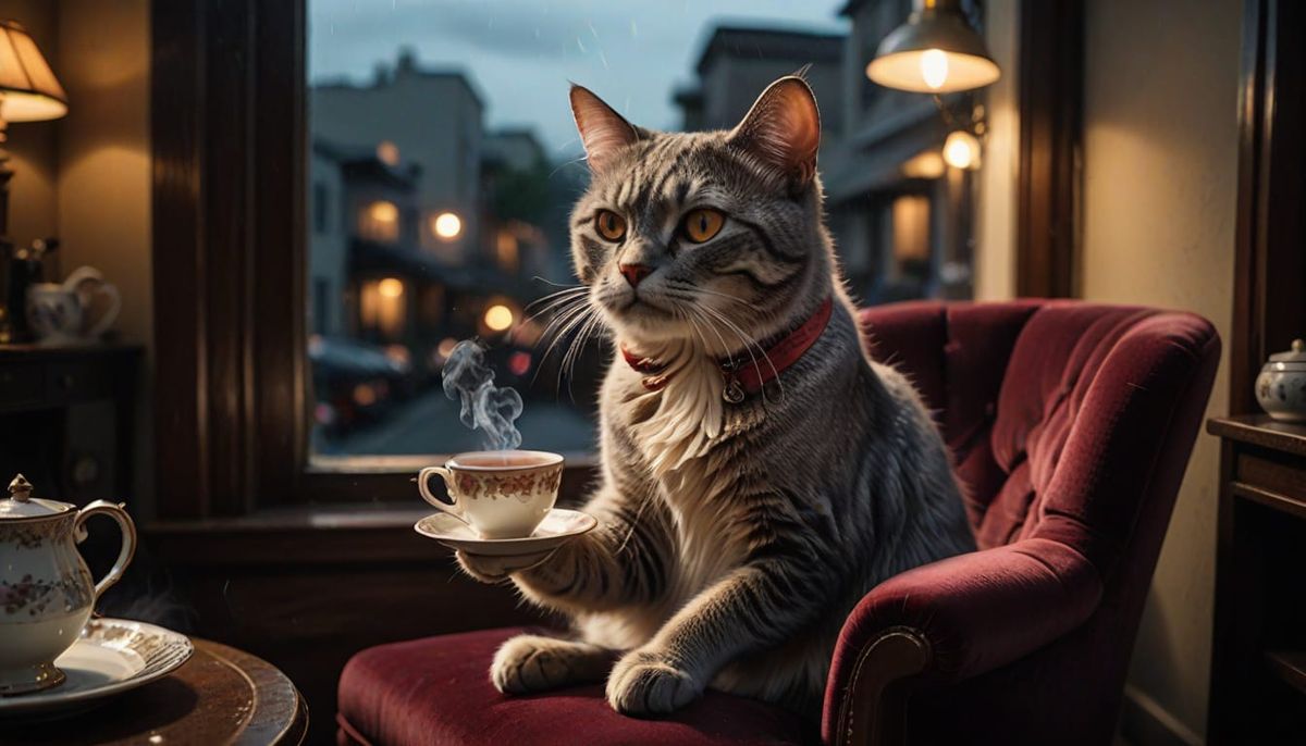 This image shows a cat in a luxurious hotel room, holding a teacup by a rain-streaked window. Below, a bustling street features small animals in raincoats.