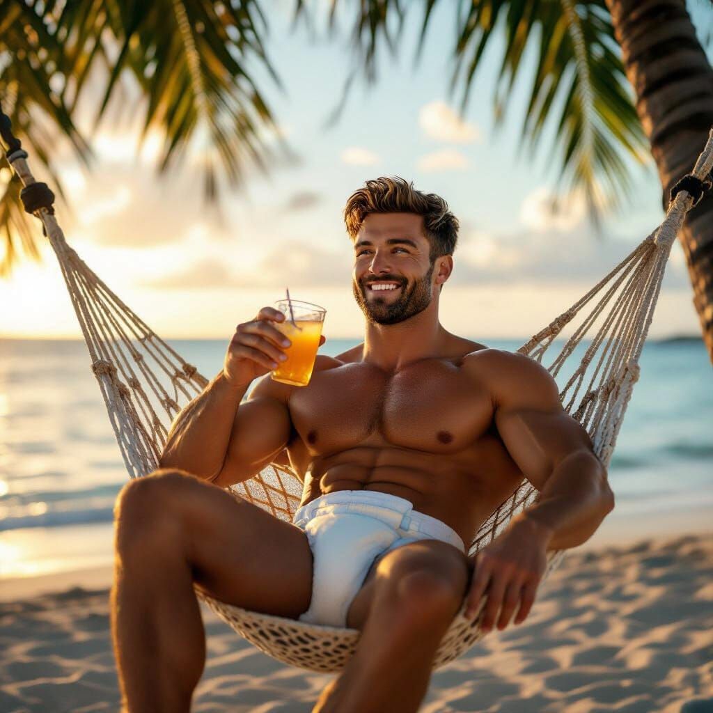 This image shows a muscular young man in a diaper relaxing in a hammock on a tropical island. The scene is hyperrealistic with dramatic lighting and a shallow depth of field.