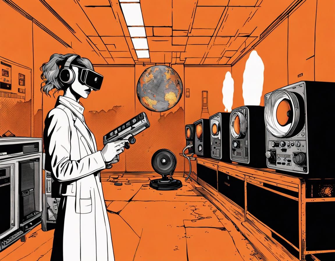This image is a haunting blend of cyberpunk and tropical decay, featuring a female model in VR goggles amidst a graveyard of used cars and palm trees, with giant waves and intense white light in the background.
