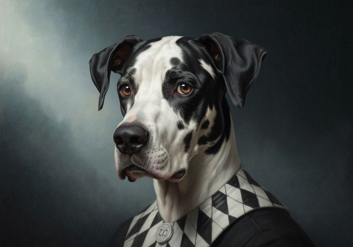 A hyper-detailed oil painting of a harlequin Great Dane, rendered in a baroque, chiaroscuro style with thick brush strokes and dark, vibrant colors. Masterpiece quality.