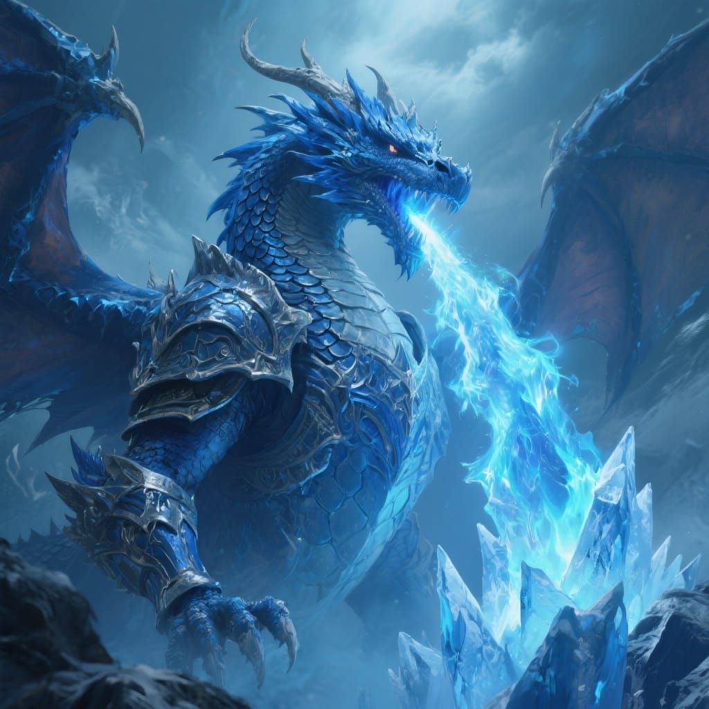 A striking picture of a blue dragon exhaling ice and fire. The dragon is depicted with detailed glacial armor and scales, against a dramatic backdrop, with cinematic lighting, in a digital matte painting style.