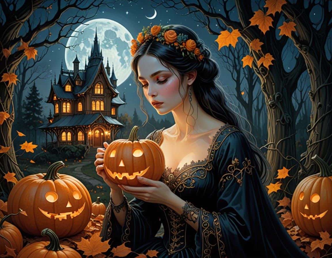 A surreal Art Nouveau painting of a gothic woman enjoying tea inside a large pumpkin house in the woods, illuminated by ethereal moonlight.