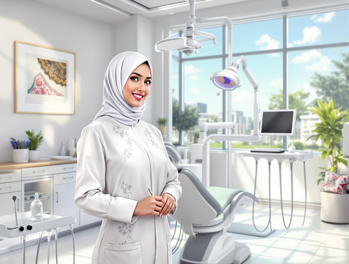 This image shows a confident young Palestinian female dentist standing beside a sleek dental chair, surrounded by advanced equipment and subtle cultural touches, in a bright and modern clinic.