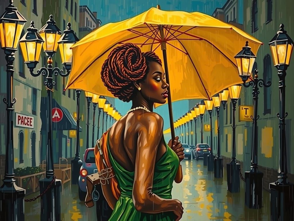This image shows an African American woman with braided hair walking in the rain under a yellow umbrella, surrounded by lit street lamps, rendered as thick impasto oil on canvas.
