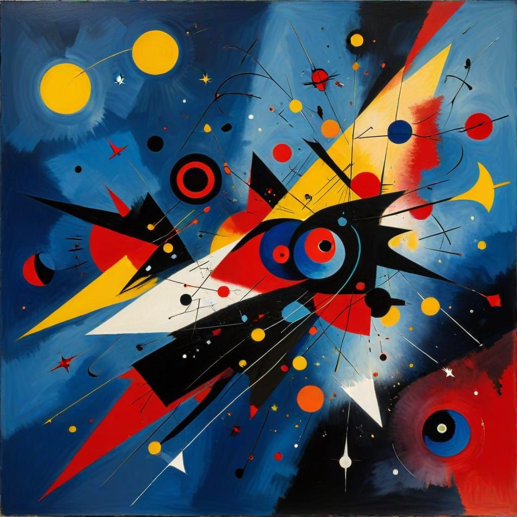 This abstract art piece features a dynamic blend of vibrant colors, geometric shapes, and organic forms, with fluid lines and fractal patterns, evoking the energy of Kandinsky and the whimsy of Miró. Dominant primary colors contrast with black and white backgrounds, recalling modern abstract art, while s...
