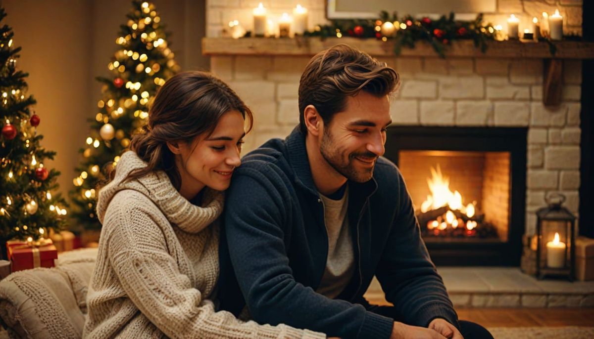 A medium shot captures a cozy Christmas scene with a man and woman by a fireplace. Presents sit under a twinkling pine tree, with a frosty window and warm firelight enhancing the peaceful atmosphere.