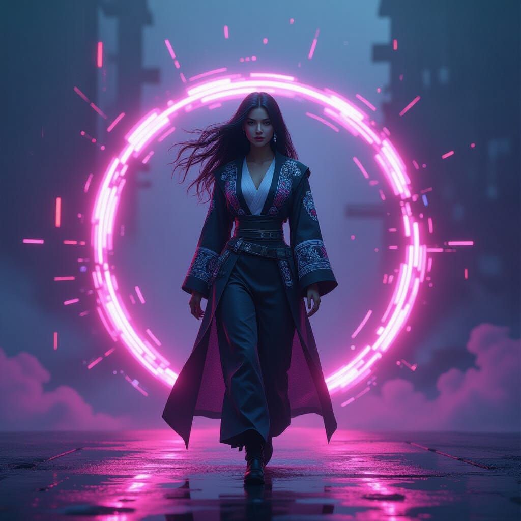 This image shows a woman emerging from a digital portal. The scene is filled with cyberpunk and surreal elements, with dynamic lighting and intricate details creating a sense of powerful control.