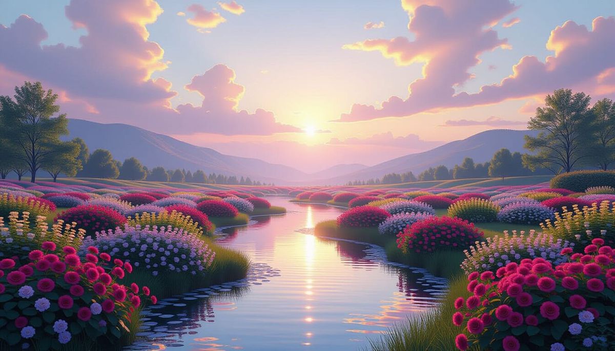 This image shows a vast, panoramic view of a luminous, infinite garden under a serene sky with rivers of light. Rendered in a hyperrealistic digital style, it evokes peace and wonder.