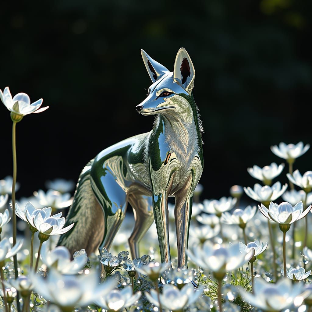A futuristic art deco scene of a chrome fox in a garden. The metallic ice flowers reflect sunlight, blending nature and technology in an ethereal style.