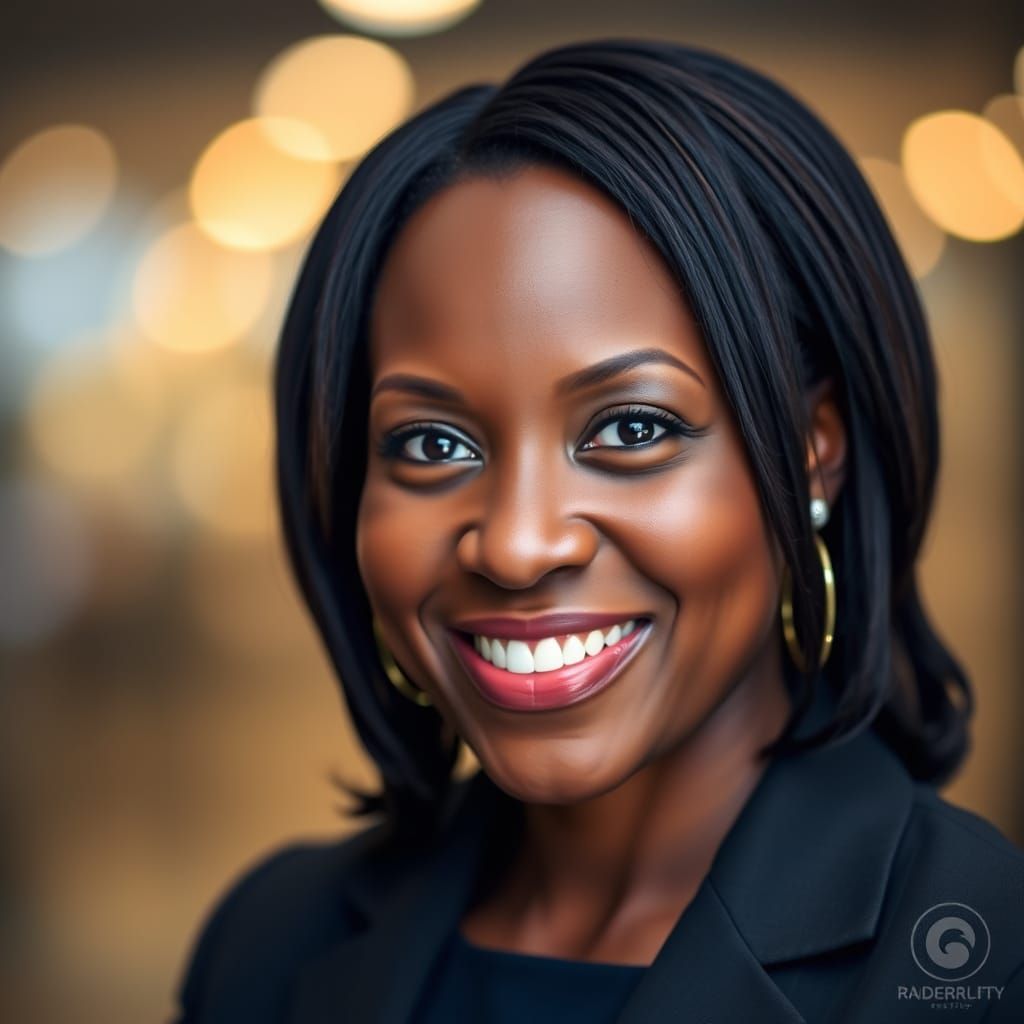 This image showcases a close-up portrait of Colleen Makhubele in professional business attire. The shot features a warm smile and blurred background, with studio lighting and vibrant colors.
