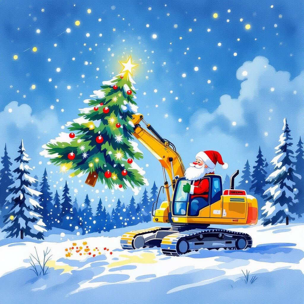 A cheerful watercolor illustration of a yellow excavator in a Santa hat lifting a giant Christmas tree. Set in a snowy forest with festive lights, rendered in a loose, expressive watercolor style.