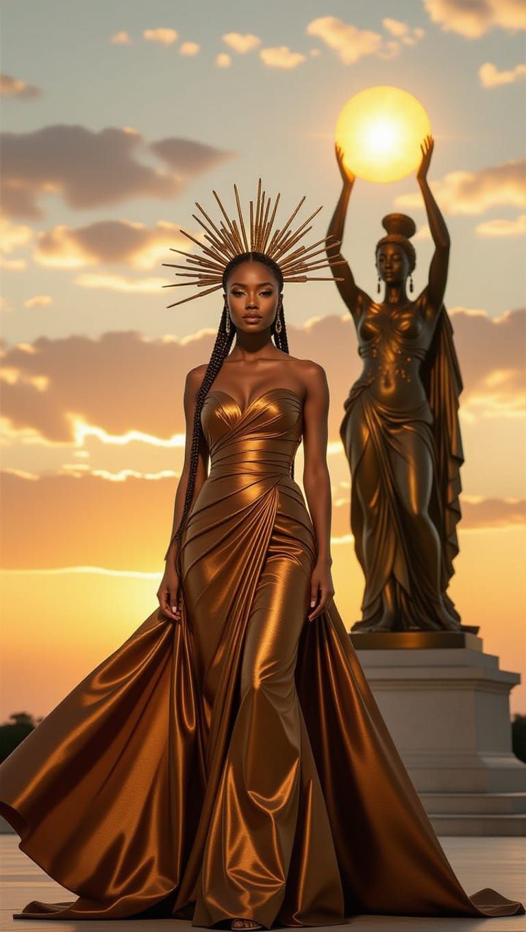 This image shows a regal African American woman in a bronze gown with metallic accents, and braided hair adorned with bronze spikes. The scene is bathed in warm light, blending Afrofuturist and neoclassical elements.