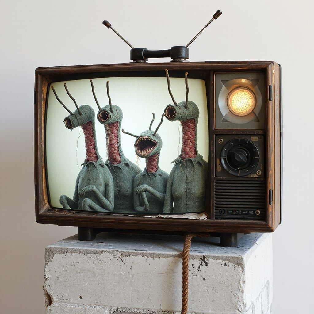 This image features a surreal photograph of abstract, disturbing figures with tubular necks and mouth holes, emerging from cocoons. The style is reminiscent of early 20th-century surrealist photography, with a limited grey and black palette.