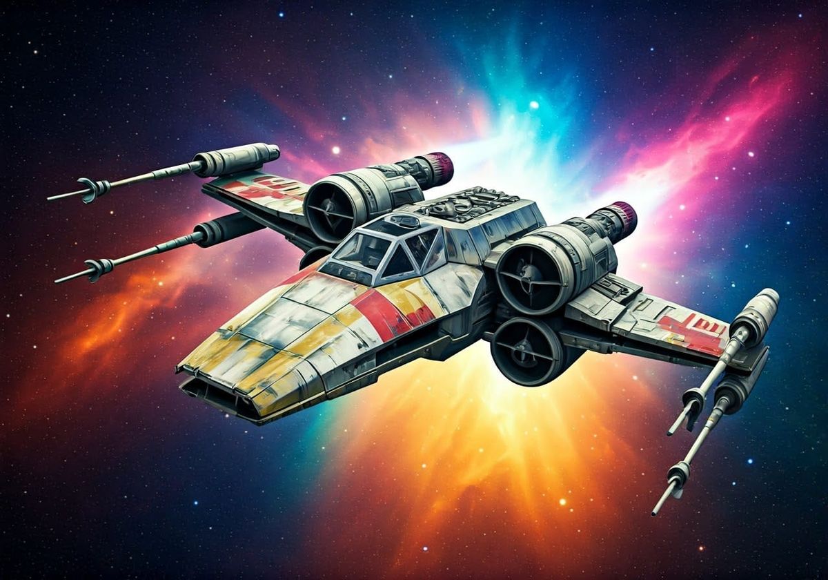 An X-Wing fighter (Star Wars) flying through Cosmic space
