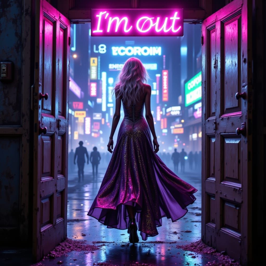 <lora:Zombies1:1.0> <lora:Accu:1.0> <lora:Iridescent Beauty:1.0> Gorgeous female zombie in lavish gown, shimmery glitter white hair, walks away from camera, exiting through double doors, glowing neon glitter text "I'm Out" in futuristic, cyberpunk style, reminiscent of Ash Thorp, Simon Stalenhag, and ...