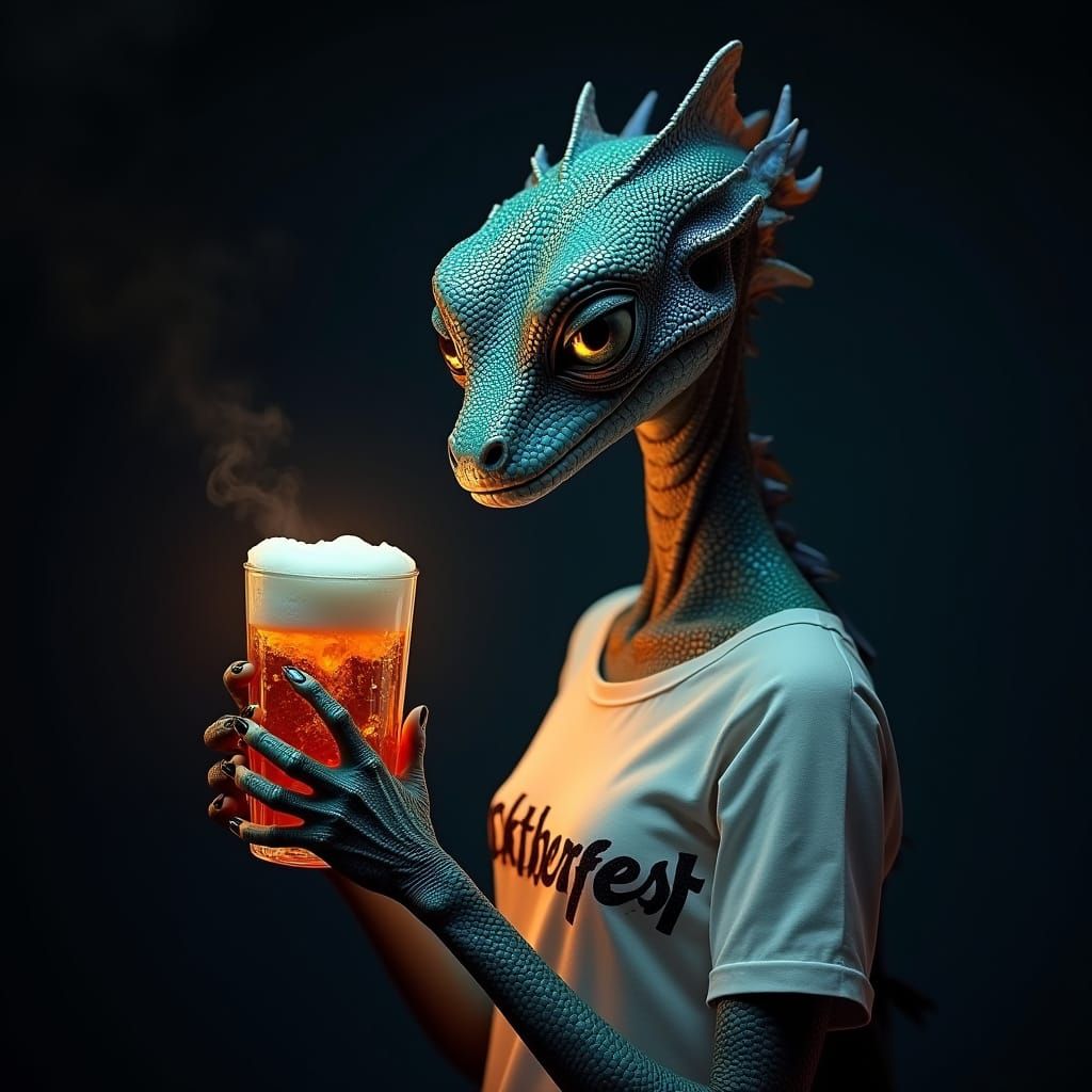 A digital painting of a reptilian humanoid female with shimmering scales and an otherworldly glow, surrounded by a dark, mysterious atmosphere, reminiscent of futuristic landscapes and neon-lit scenes.