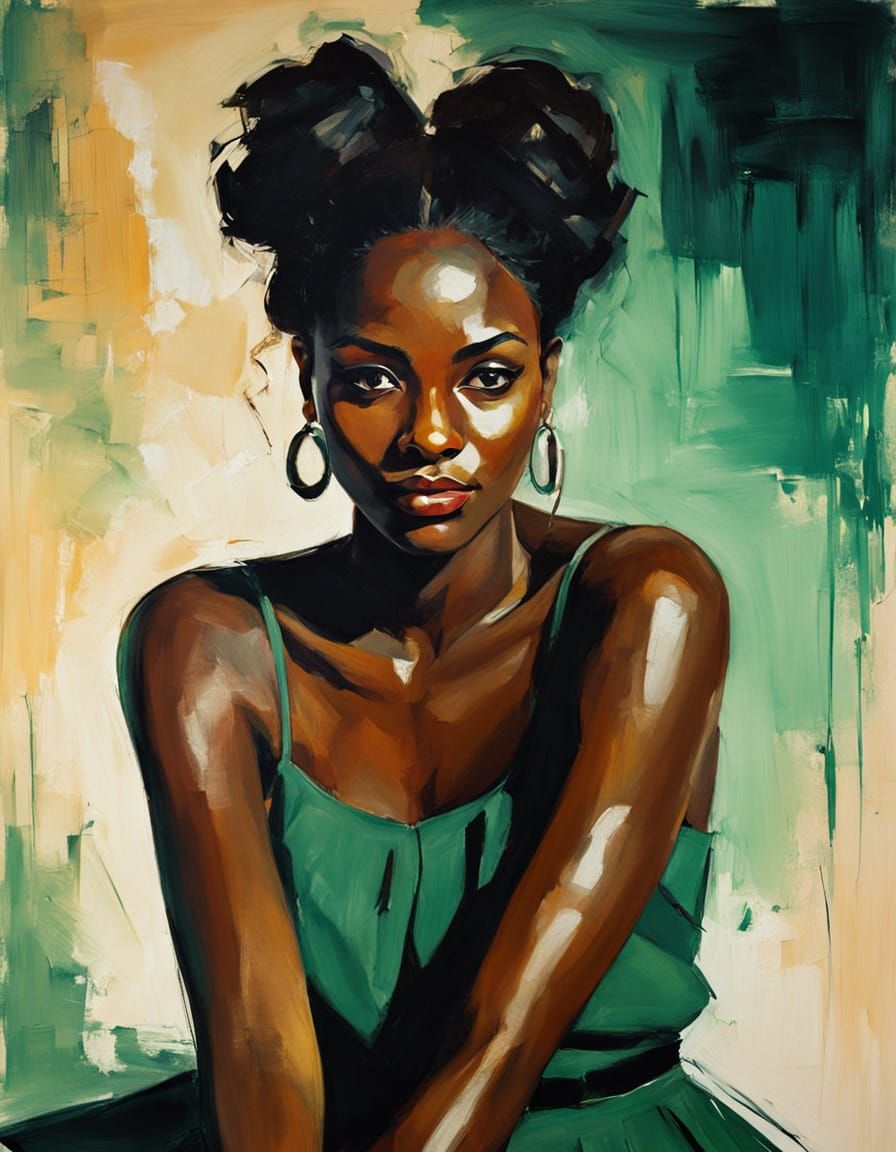 A striking portrait of a dark-skinned woman with lush black hair and a sly smile. The expressionist painting features a vibrant color palette, warm lighting, and elegant details in an abstract style.