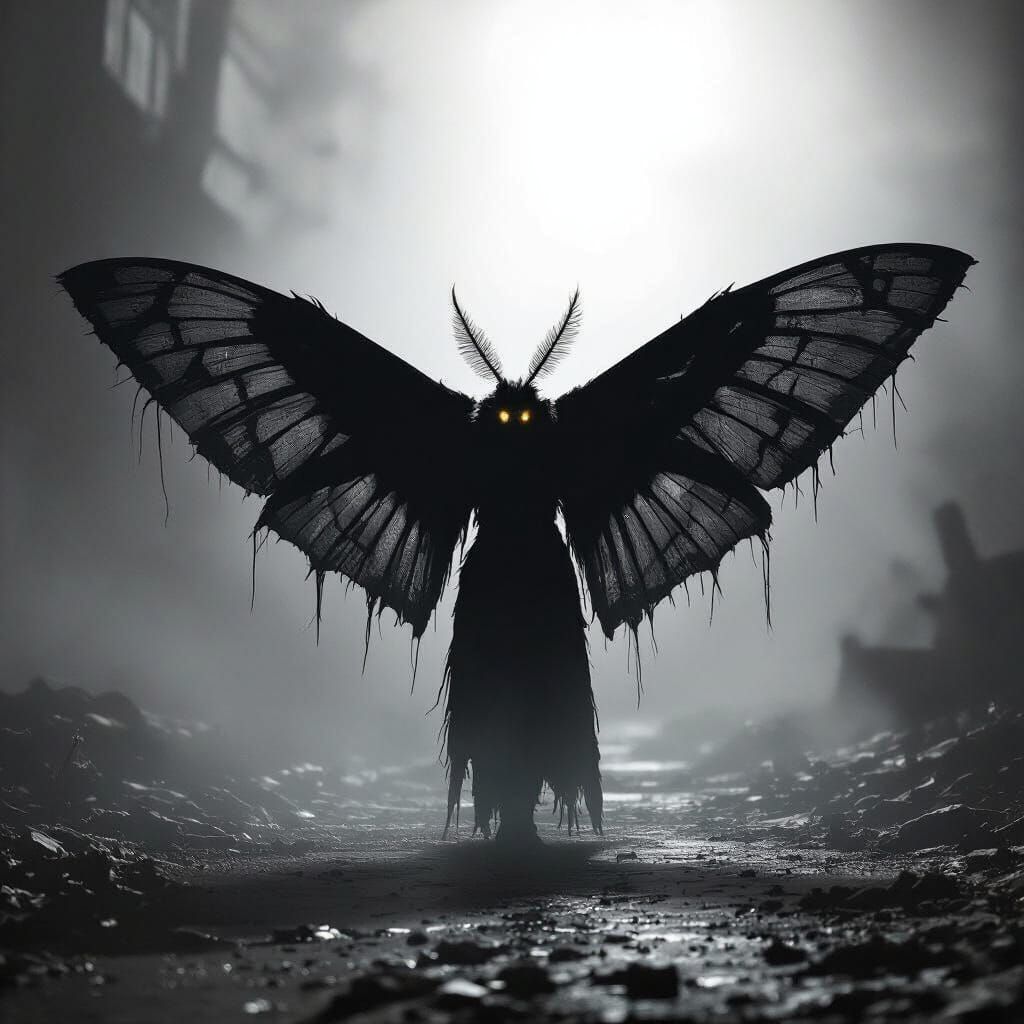 This image shows a grainy, high-contrast black and white depiction of Mothman with tattered wings. The image evokes a dark noir aesthetic with a cinematic and eerie atmosphere.