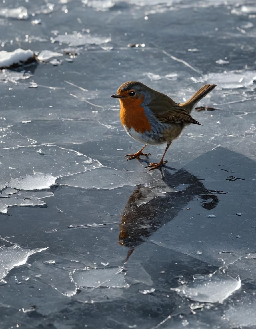 A striking picture of a European robin perched on broken ice. The black and white image captures the bird in full body with stunning detail, perfect shadows, and hyperrealistic rendering.