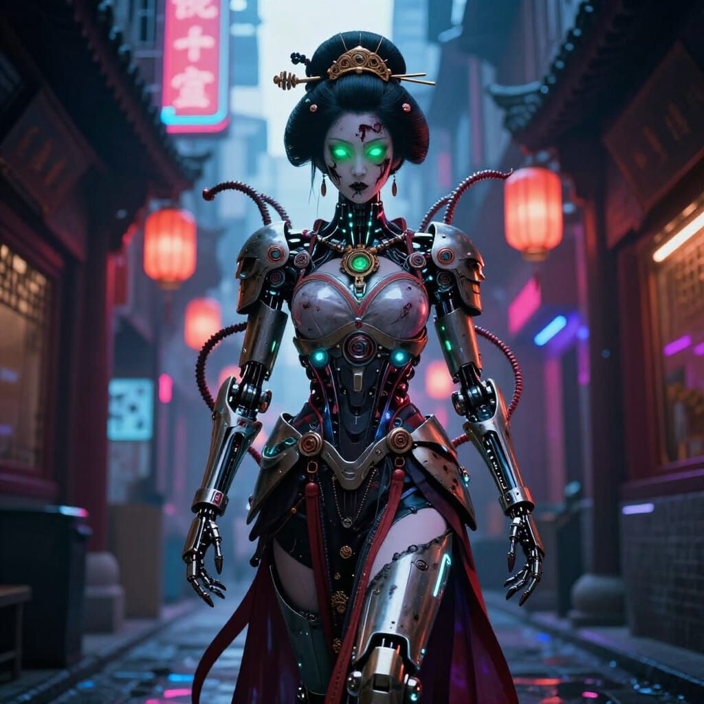 This image depicts a futuristic geisha warrior in glowing cybernetic armor, walking through a neon-lit cyberpunk city. Mechanical parts and eerie green eyes add to the gritty sci-fi aesthetic.