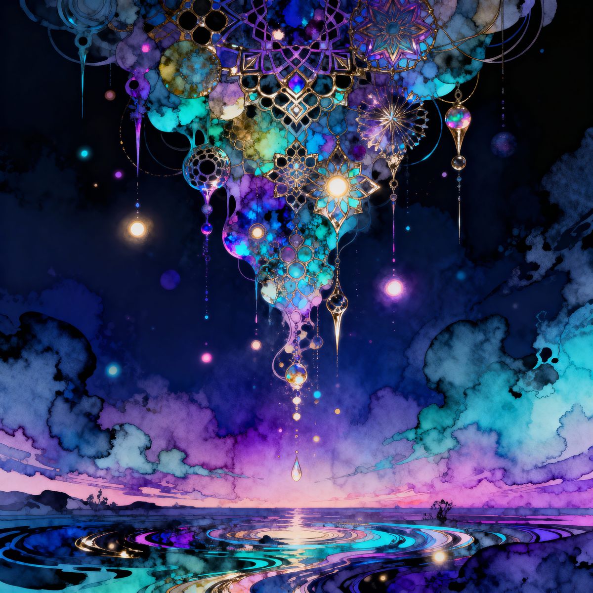 This image showcases a surreal, kaleidoscopic cascade with vivid gradients and glowing elements. It features a blend of modern art and graphic novel aesthetics.