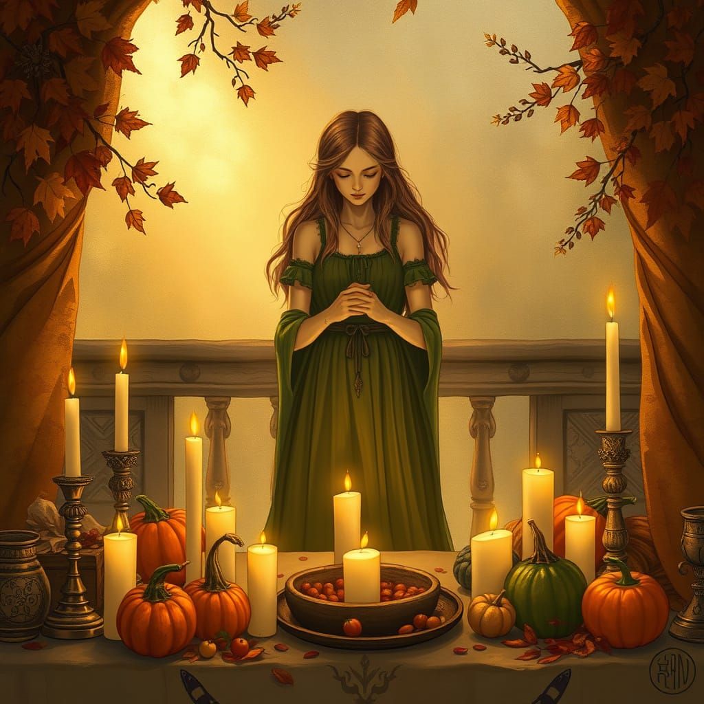A scene of a woman at an altar giving thanks for the harvest. The image features candles, autumn leaves, and fruits, bathed in golden light, with a whimsical fantasy art style.