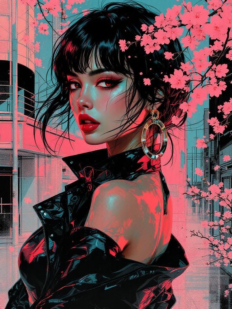 A striking picture of a vintage pin-up figure in a cyberpunk aesthetic. The figure is set against an abstract geometric background with cherry blossoms, rendered with high contrast and tactile realism.