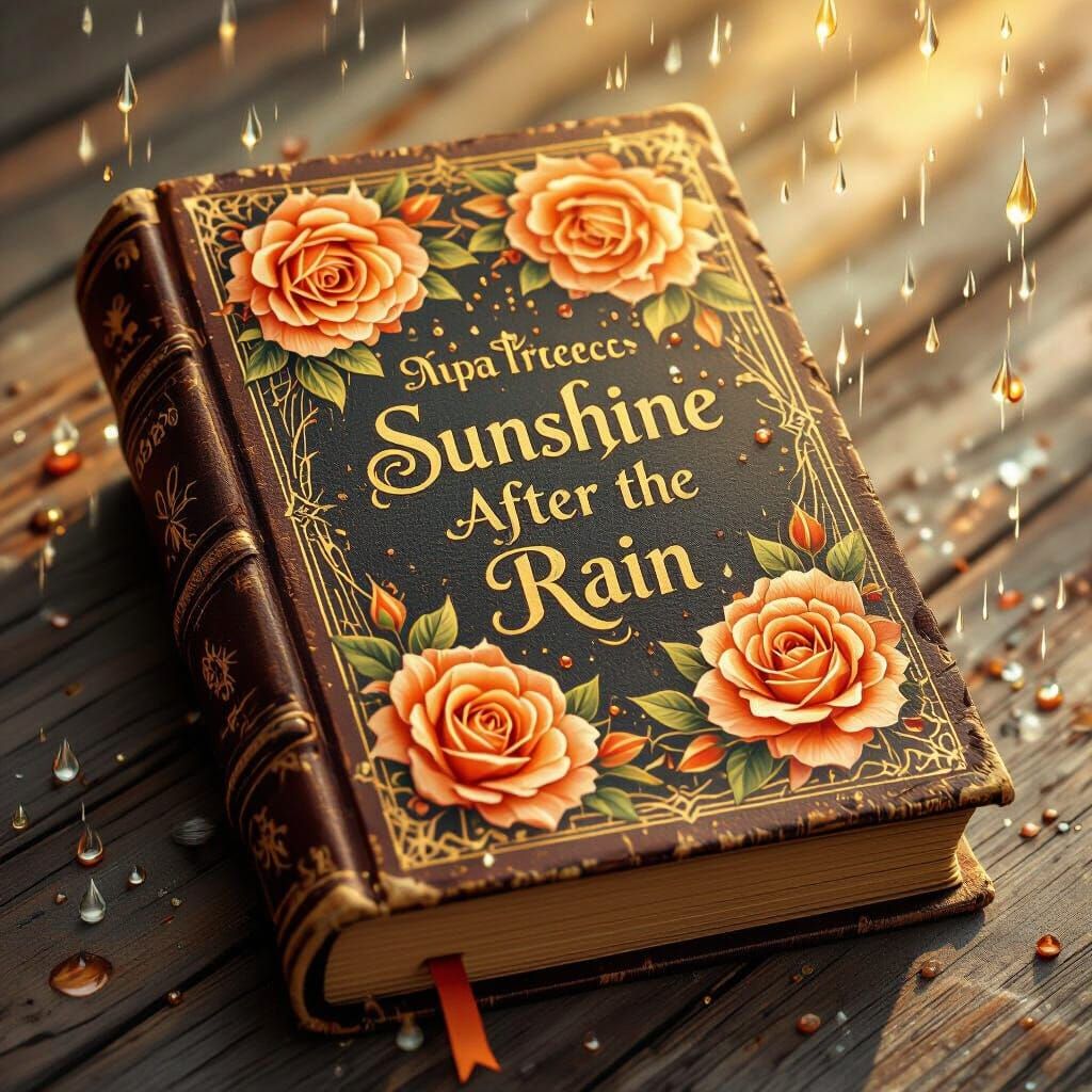 A digital rendering of an antique book titled 'Sunshine After the Rain' displaying roses, sunshine, and raindrops. The image incorporates fractal geometry and abstract vector elements in a modern digital art style.