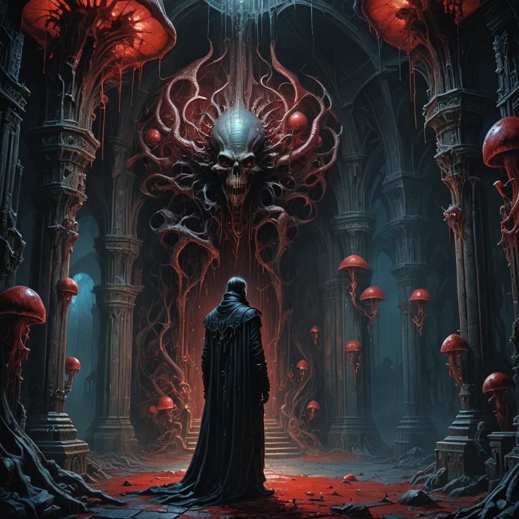 This image shows a blood-soaked vampire in an ornate chamber, reminiscent of dark fantasy art. The scene features gothic architecture, luminescent mushrooms, and a palette of deep blues and crimson reds, with cinematic lighting.