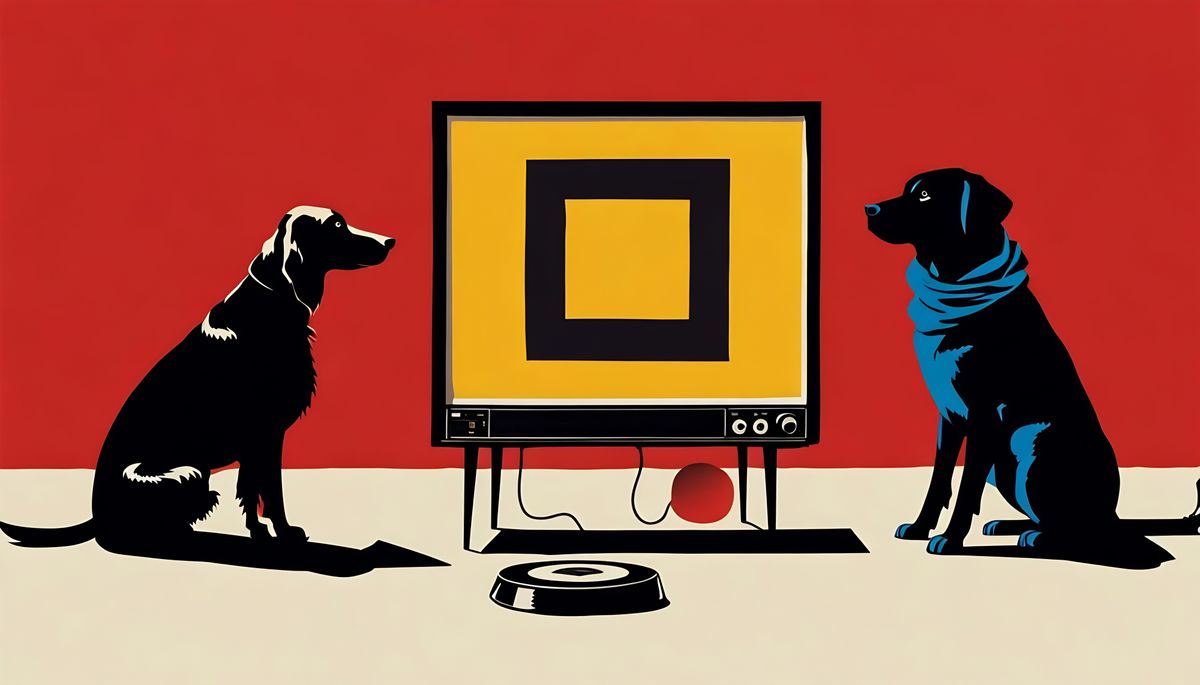 This image shows a thought-provoking fusion of dark hip-hop and abstract expressionism, featuring a dog in a complex, existential setting.