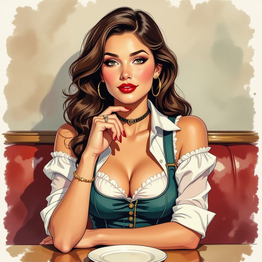 This image shows a busty waitress in a wild west diner, rendered in a polished watercolor and ink comic noir storybook style.