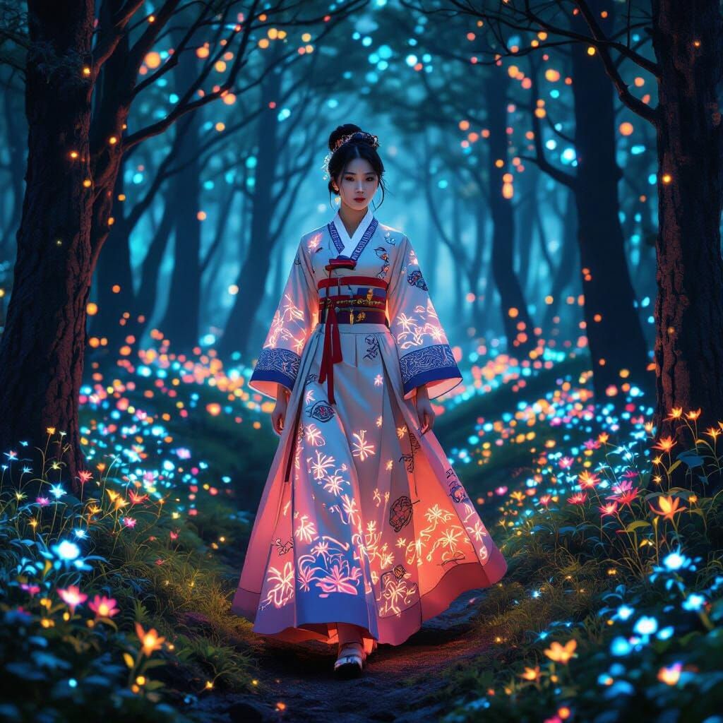 A striking picture of a Korean woman in a brightly patterned, modern Hanbok walking through a bioluminescent forest. The image is rendered in a hyperdetailed digital art style, with dynamic lighting.