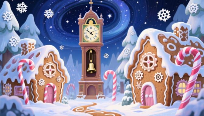 A hyperdetailed storybook illustration of a charming winter village made of frosted gingerbread houses and candy cane trees. A clock tower reveals a starry night sky.