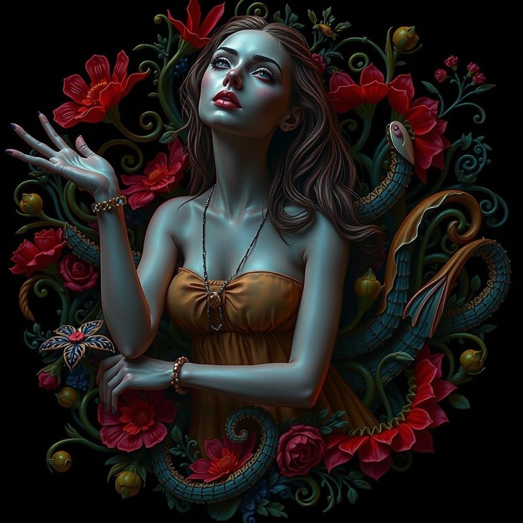 This image shows a woman in a yellow dress in a surreal garden setting. The scene is reminiscent of hyperrealist art with vibrant colors and elements of glitch and op art.