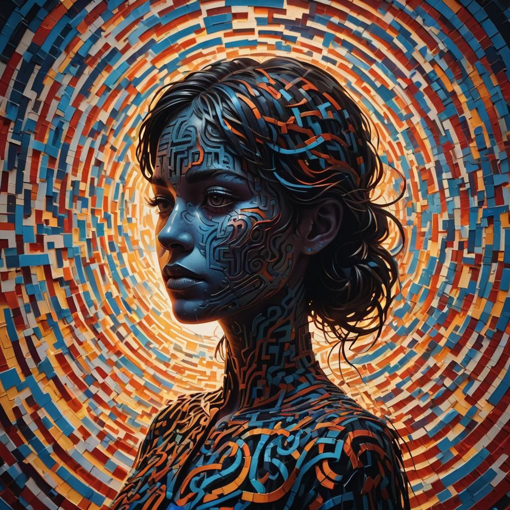 A hyperrealistic splash art image of a woman's silhouette composed of intricate labyrinths. The mid shot features a 2/3 face angle, side lighting, and a dramatically colorful background.