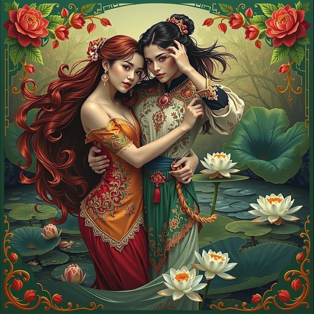This image shows two figures in elaborate costumes embracing near a pond filled with lilies and lotuses. Intricate lace details and a flourishing forest create a rich, vibrant scene.