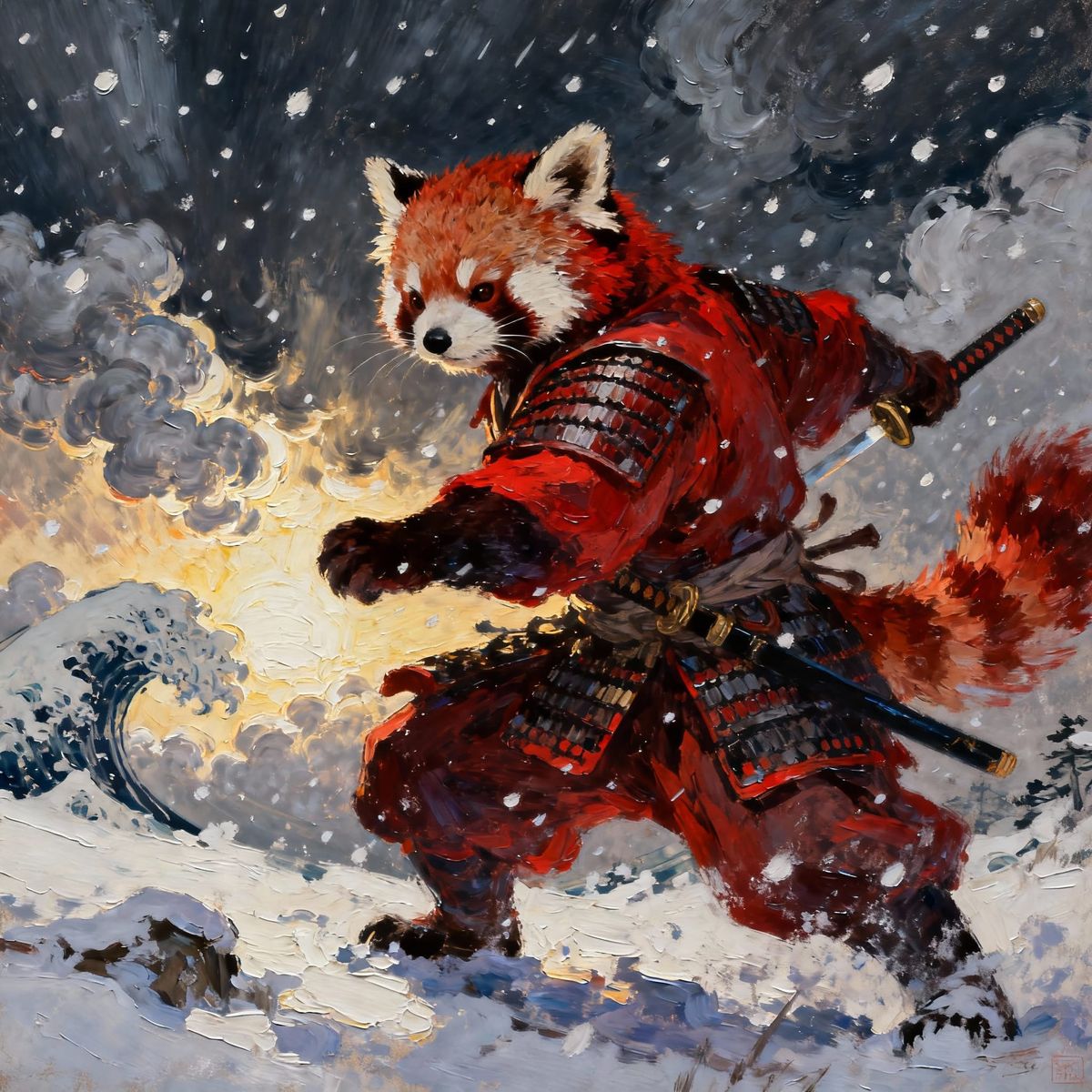 An epic oil painting depiction of a Red Panda samurai. Intricate fur texture, (dramatic pose, dramatic surroundings 2.0). Snow clouds gathering in the distance create a magical atmosphere. Epic masterpiece, insanely detailed.