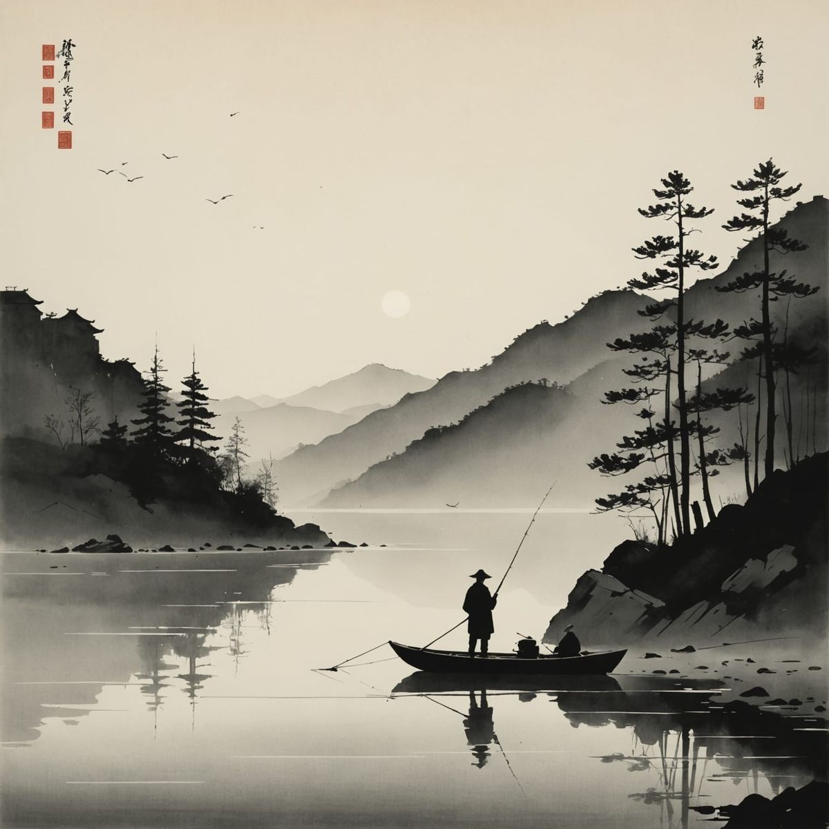 This image depicts a solitary figure fishing at night by a creek, rendered in a minimalist Chinese ink wash style with a serene atmosphere.