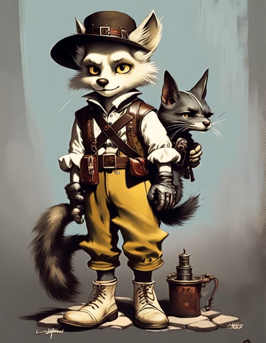 This image shows a young girl dressed as a werewolf, standing in a dimly lit, cobblestone street, inspired by European art and film noir styles, with a mix of vibrant and muted colors.
