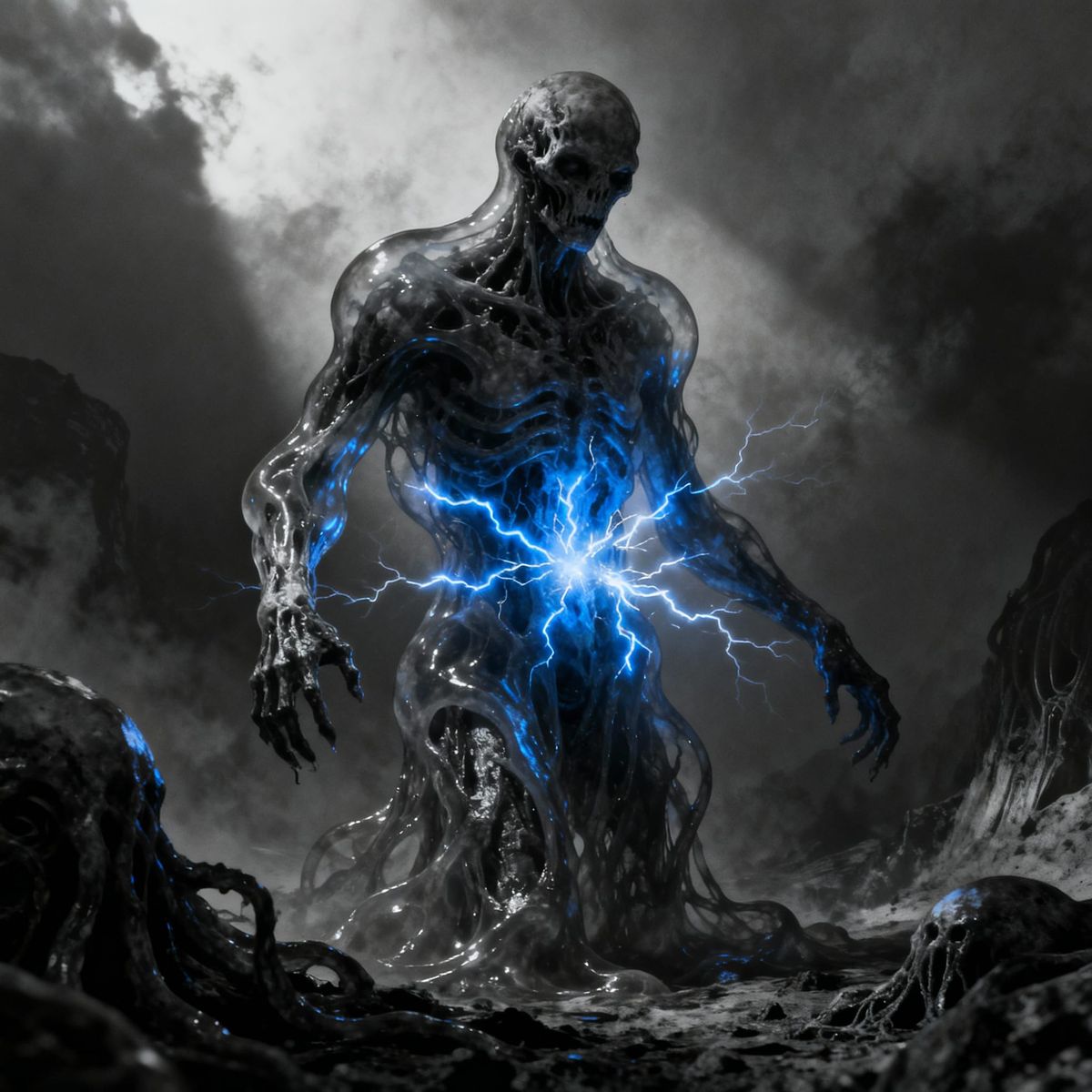 This image depicts a colossal, grotesque undead jelly humanoid with electric blue sparks. It features stark contrast and coarse charcoal textures, evoking visceral horror concept art.