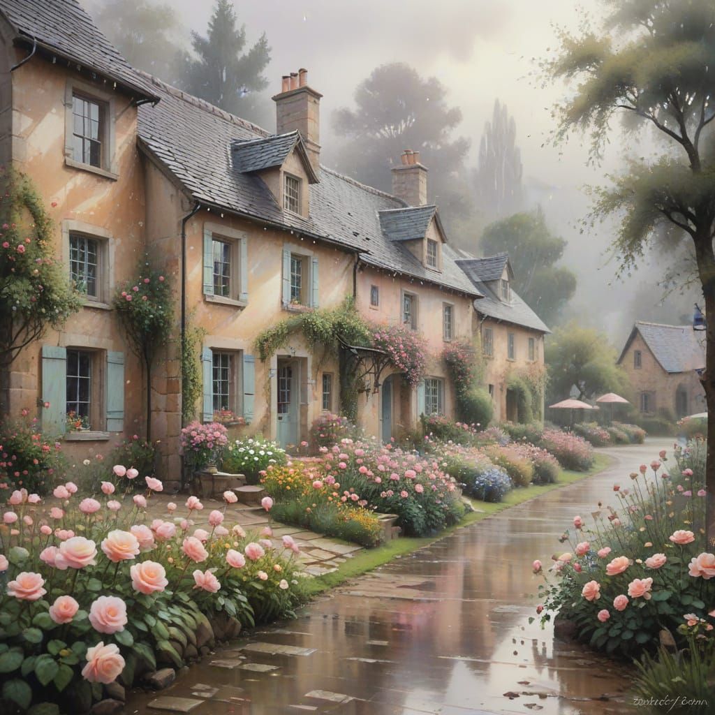 This image shows a quaint village scene rendered as a watercolor painting. Rain falls gently on stone cottages and rose gardens, creating a soft and dreamy atmosphere with pastel colors.