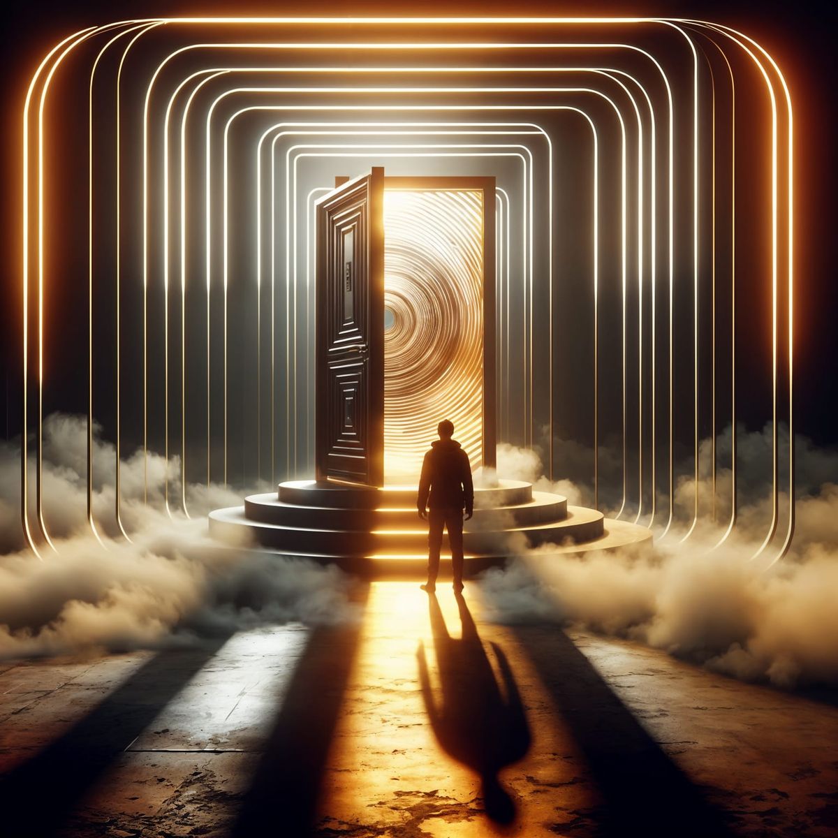 A captivating image of a figure standing before a mysterious door, seemingly unconcerned about the destination. The scene, rendered in vibrant colors, captures a quest for self-discovery with hyperrealistic details.