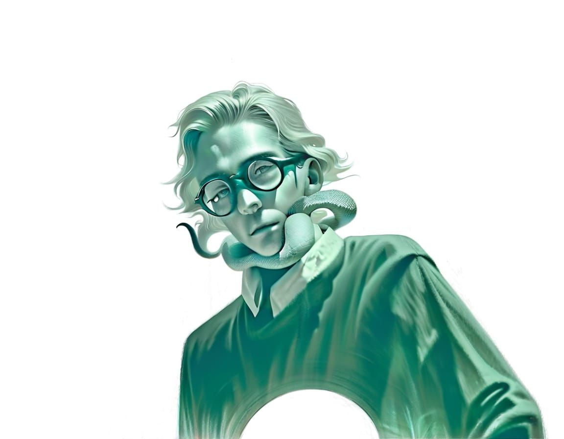 A striking picture of a snake-haired woman standing defiantly. The artwork features dramatic lighting, warm golden hues, deep shadows, and fantasy elements rendered in a detailed, high-contrast style.