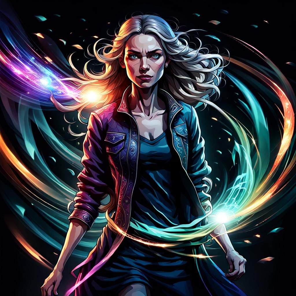 This image shows a woman emerging from a smartphone screen, surrounded by motion blur and magical energy. The digital art features dynamic, swirling colors and intricate, glowing runes with dramatic lighting.