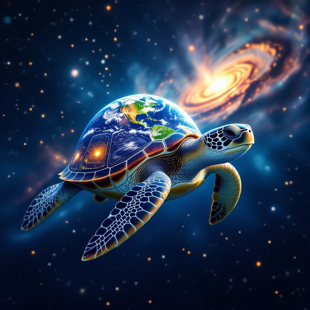 This image shows a hyperrealistic, detailed photo of an ancient sea turtle with Earth on its shell, swimming through a glowing, bioluminescent galaxy with nebulae and cosmic dust.